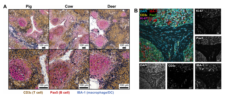 图A是三重显色IHC结果,以猪、牛、白尾鹿的气管支气管淋巴结为样本,同步检测CD3、Pax5、IBA-1。结果显示三种物种的淋巴结免疫结构符合预期组织学特征:副皮质区以CD3+ T细胞为主,被膜下、小梁和髓窦以IBA-1+巨噬细胞/DC为主,淋巴滤泡以Pax5+ B细胞为主。该结果证明三重显色IHC可有效用于跨物种淋巴结免疫结构的比较分析。
