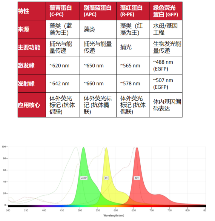 光谱:GFP及其衍生物覆盖蓝、青、绿、黄光谱;R-PE和APC的激发和发射波长更长,穿透力更强,受细胞自发荧光干扰更小。