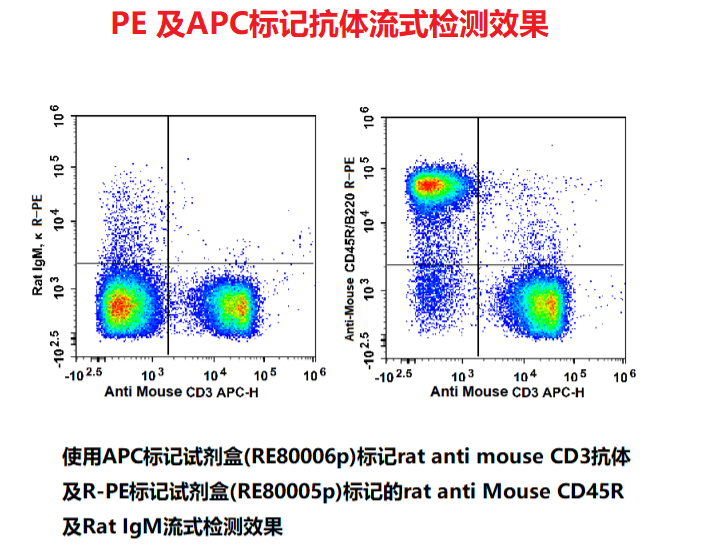 R-PE和APC是提取纯化的生化试剂,需要偶联到抗体上,再通过抗原-抗体反应结合到目标分子上,通常用于对固定细胞或细胞表面进行染色。