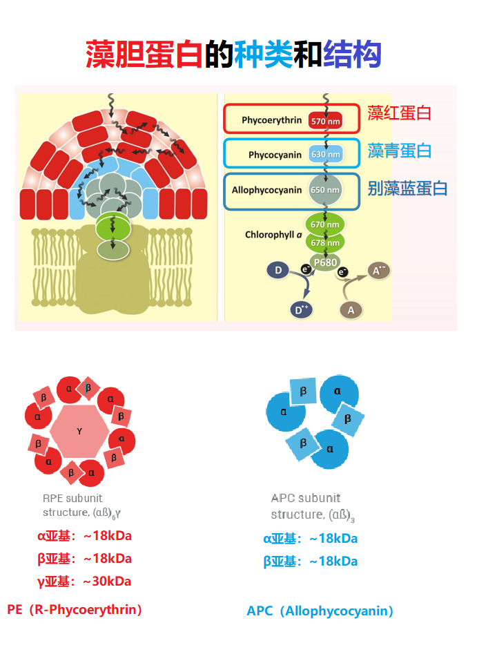 R-PE和APC等藻胆蛋白的荧光基础来源于不同种类和数量的藻胆色素在蛋白骨架及其亚基单位上的组合方式,最开始是作为某些光能自养型藻类进行光合作用的基本单位,融合基因重组表达通常有一定的难度,因此其通常是在含有此蛋白的藻类经化学提取纯化而来。