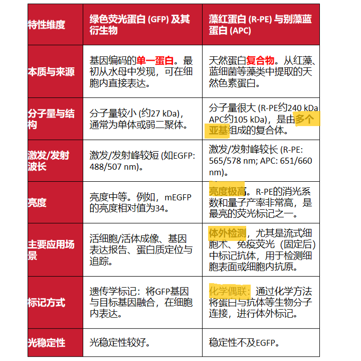 3)应用场景侧重点不同: 需要在活体、活细胞中实时、动态观察蛋白质行为、细胞命运或基因表达时,GFP及其衍生物是不可替代的工具。 在进行高通量、高灵敏度的体外检测,如流式细胞术分析细胞表面标志物、分选特定细胞群时,R-PE和APC偶联的抗体是金标准之一。它们不适用于活细胞成像。
