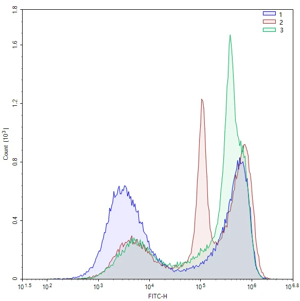 1:小鼠细胞悬液+ 不封闭+Fluor488-羊抗小鼠IgG; 2:小鼠细胞悬液+ rat anti mouse CD4+Fluor488-羊抗大鼠IgG; 3:小鼠细胞悬液+ Fluor488-羊抗大鼠IgG; |