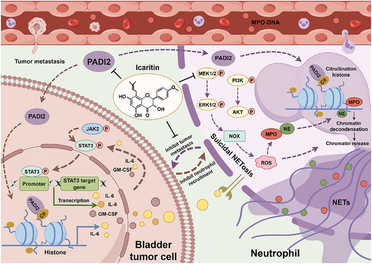 在肿瘤微环境中,负调控分子和多种免疫细胞亚群会抑制抗肿瘤免疫,其中中性粒细胞及其产生的中性粒细胞胞外陷阱(NETs)所构建的炎症微环境,被证实会促进肿瘤转移,然而目前尚无专门针对中性粒细胞和NETs的特异性抑制药物。在此背景下,研究性论文《Icaritin inhibits the progression of urothelial cancer by suppressing PADI2-mediated neutrophil infiltration and neutrophil extracellular trap formation》,首次揭示了淫羊藿素在尿路上皮癌治疗中的潜在价值,通过深入探究其作用机制,为尿路上皮癌的治疗提供了新的思路和靶点。
